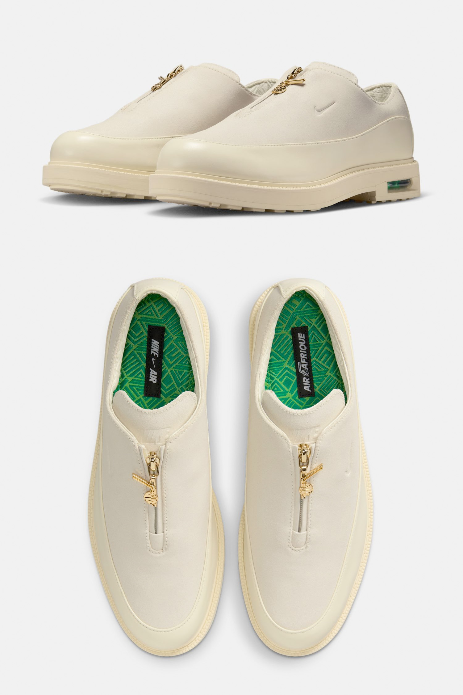Das Upper ist clean und raffiniert gehalten. Hochwertiges Leder in monotonen Coconut Milk Tönen kombiniert mit einem markanten Reißverschluss über klassischen Schnürsenkeln erinnert an oldschool Reise Luxus à la Business Class. Unter der stilvollen Oberfläche steckt ein Air Max Heel Unit, das in seiner Form an Turbinen erinnert und dem Sneaker einen Hauch Flugzeugtechnik verleiht. Die Innensohle und das Futter kommen mit einer Jacquard Musterung angelehnt an Vintage Flugzeugsitze, während die Laufsohle mit Morsecode das Wort Air Afrique buchstabiert. Genau diese kleinen Details machen den Reiz des Releases aus.
