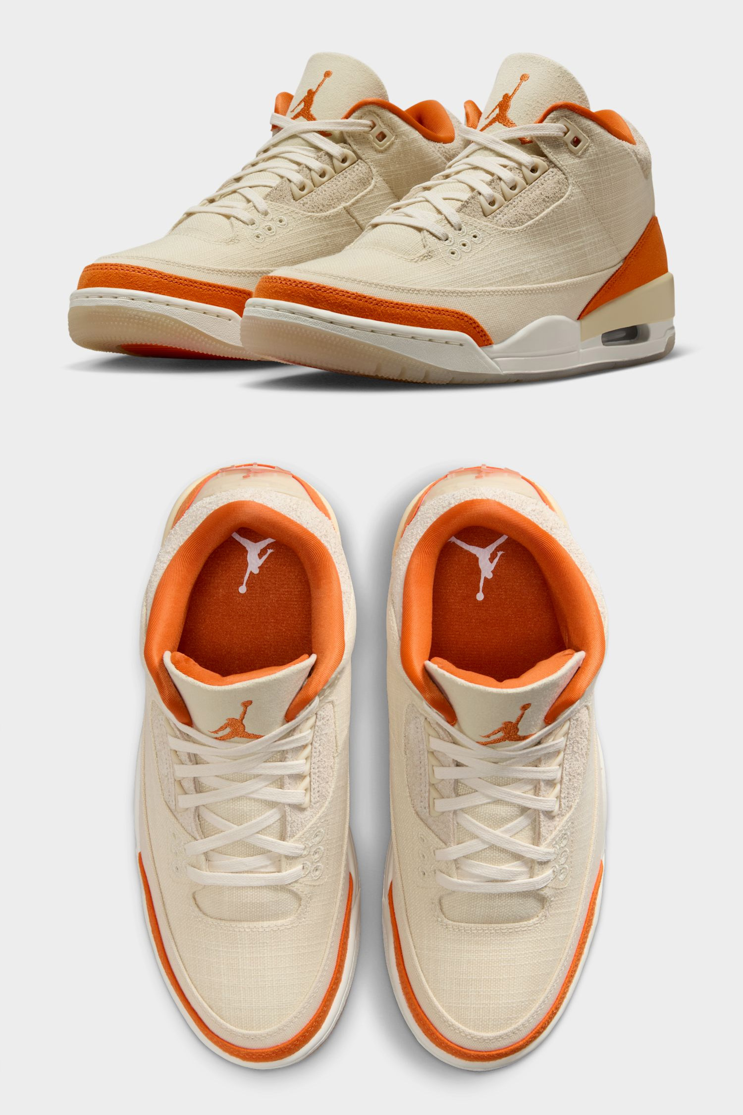 Der neue Air Jordan 3 “Starfish” (Stylecode IH7694‑200) kommt in einem auffälligen Colorway: “Fossil/Starfish/Sail”. Das beige Canvas-Obermaterial wird durch raues Wildleder an Kragen und Ösen ergänzt, während kräftiges Orange an Mudguard, Ferse und Jumpman-Logo für echte Hingucker sorgt. Die cremefarbene Mittelsohle mit halbtransparenter Außensohle bringt den passenden Mix aus Komfort und Style. Auf das typische Elefantenmuster wurde verzichtet… das Ergebnis ist ein cleaner und moderner Look.