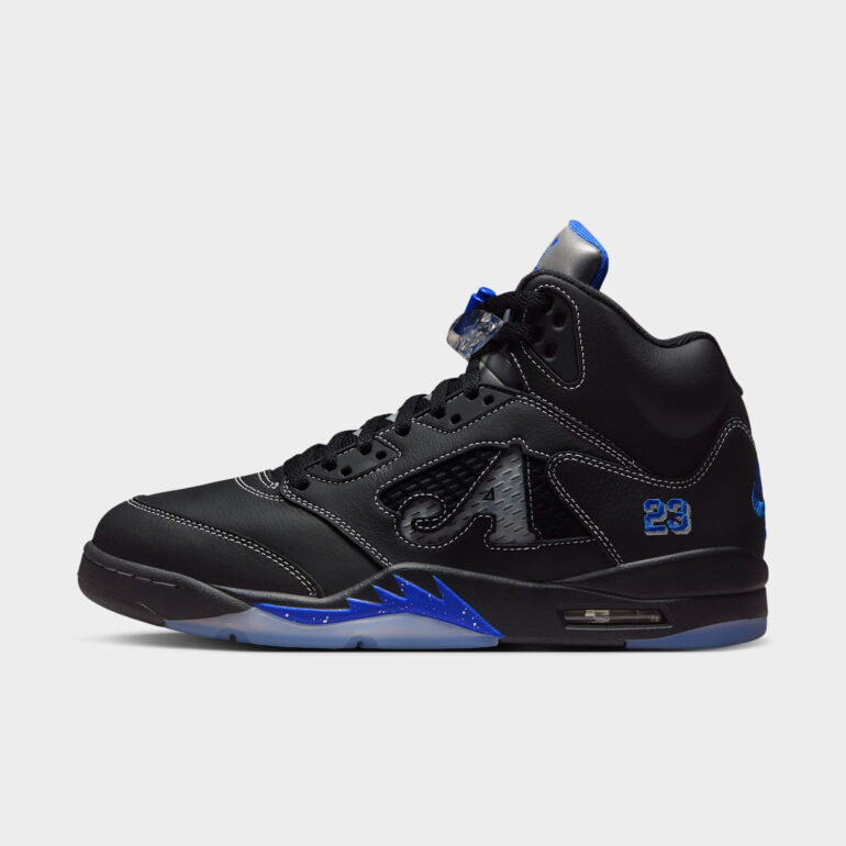Der Air Jordan 5 x Awake NY „Racer Blue“ (Stylecode: DV4982-004) bringt den Geist der 90er zurück, verfeinert mit moderner Streetwear-Ästhetik aus New York City. Das Upper kommt in sattem schwarzem Tumbled Leather, dazu knallige Racer-Blue-Highlights und silberne Akzente, die dem Klassiker einen frischen Glanz geben. Typische Jordan-5-Details wie die gezackte Midsole, die Netzeinsätze und die reflektierende Zunge sind natürlich am Start. Besonders cool: Awake NY hat sein ikonisches „A“ ins Seitennetz integriert, auf der rechten Ferse steht statt der gewohnten 23 ein „NY“, während der linke Schuh klassisch bleibt. Dual-Branding mit Jumpman und Awake NY auf der Zunge rundet das Ganze ab. So wird der Basketball-Klassiker nicht nur zur Hommage an Tinker Hatfield, sondern auch zu einem echten Statement-Piece aus der Hauptstadt der Streetwear.