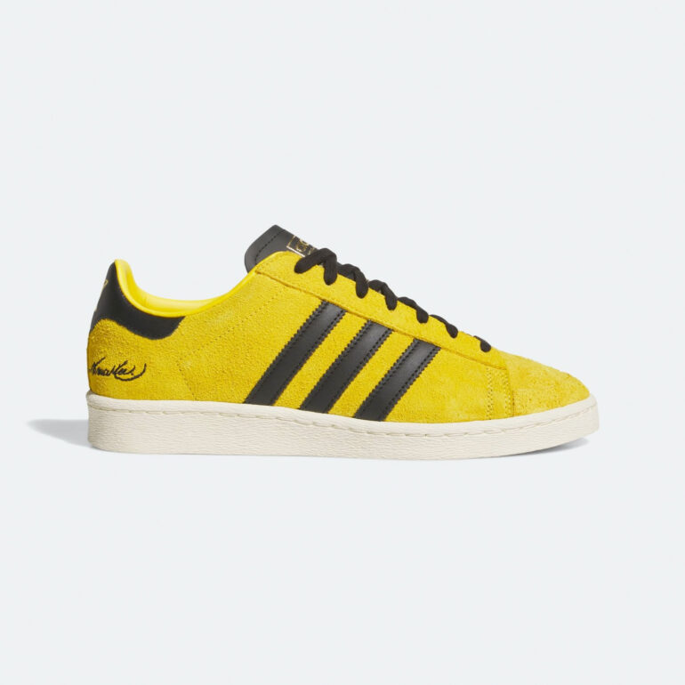 Der adidas Jabbar Low „Game of Death“ (Stylecode: JR1597) bringt 70s-Kino-Feeling direkt auf die Straße und vereint gleich zwei Legenden in einem Sneaker. Inspiriert ist der Colorway vom ikonischen gelben Jumpsuit, den Bruce Lee im Kultfilm „Game of Death“ trug, während Kareem Abdul-Jabbar in seiner Rolle als Gegner mitspielte. Das Upper kommt in sattem Gelb aus Wildleder, dazu schwarze Leder-Details an den Three-Stripes und der Ferse, die den Look perfekt abrunden. Auf der Rückseite findet sich eine goldene Bruce-Lee-Silhouette in Kick-Action, an der Außenseite seine gestickte Signatur und die Insole zeigt Szenenbilder aus dem Film. Sogar die Box ist voll mit Special Graphics, was den Release zu einem echten Sammlerstück macht.