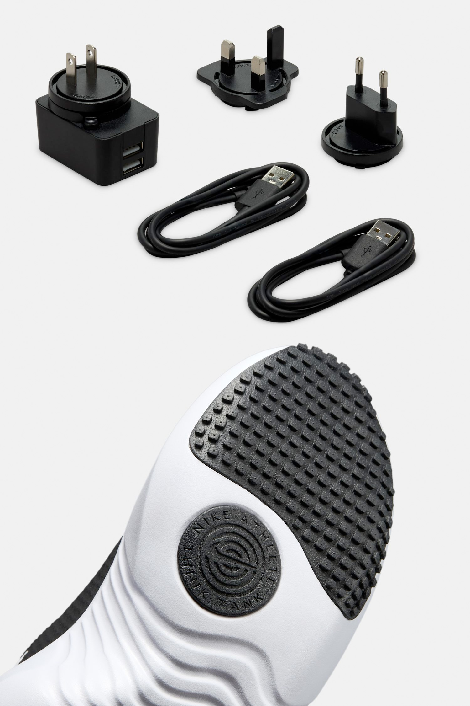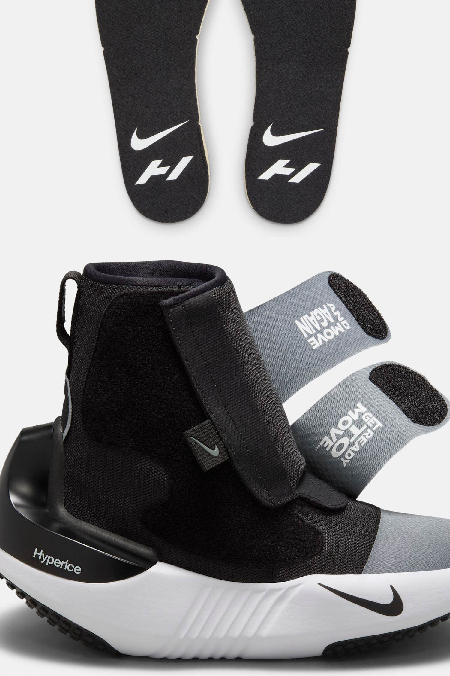 Der Nike Hyperboot mit Stylecode IM3072-001 ist nicht einfach nur ein Sneaker, sondern ein Wearable Boot, entstanden aus der Zusammenarbeit von Nike und Hyperice. Der Colorway kommt in cleanem Schwarz und setzt voll auf Funktionalität mit einem minimalistischen, technisch geprägten Look. Das Besondere daran ist die Kombination aus Normatec Druckmassagezonen und HyperHeat Heizelementen im Upper, die sowohl beim Aufwärmen vor dem Training als auch bei der Regeneration danach für Entlastung sorgen. Der Boot läuft über einen integrierten Akku, Einstellungen wie Wärme und Kompression können in mehreren Stufen reguliert werden. Optisch erinnert das Ganze eher an einen futuristischen High Top Boot ohne klassische Schnürung, sondern mit einem festen Wrap Lock System, das perfekten Halt bietet.
