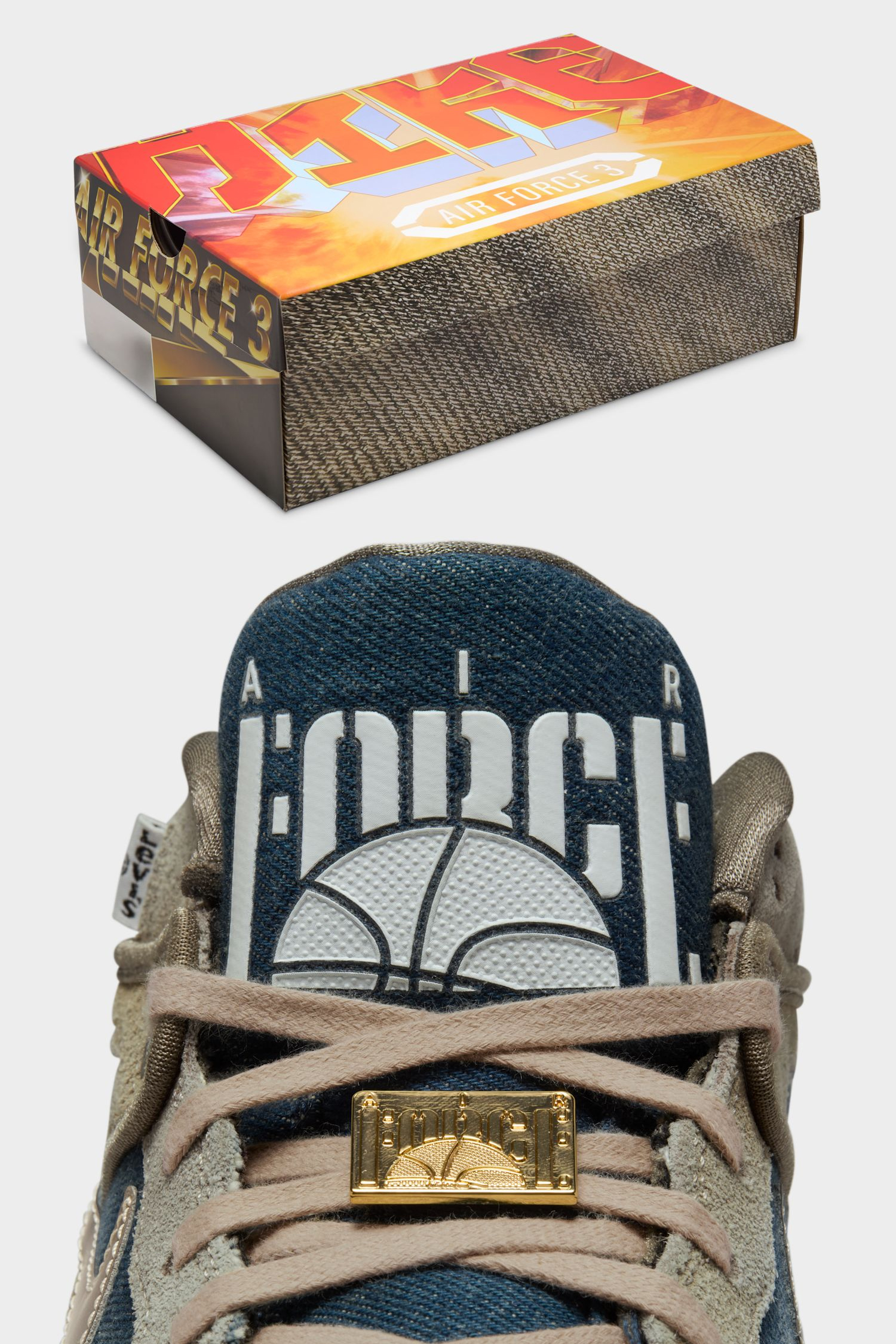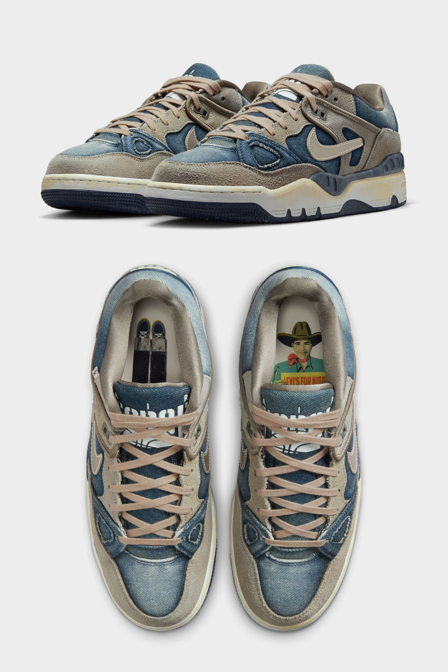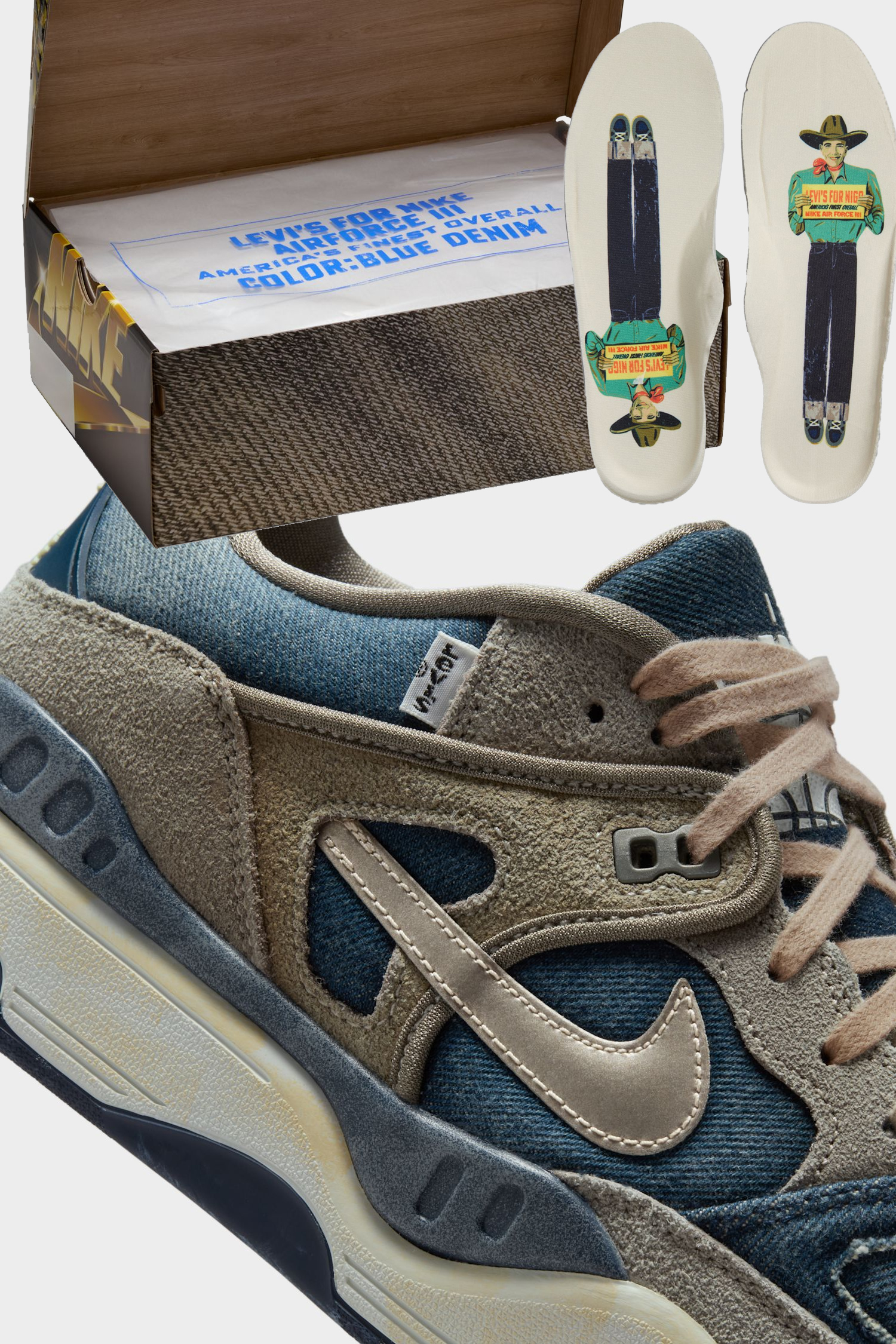 Der Nike Air Force 3 Low „Olive Grey“ (Stylecode: HQ0262-001) bringt eine seltene Dreifach-Kollabo auf die Straße, bei der Nike, Levi’s und Nigo ihre Handschrift vereinen. Der Colorway kombiniert ausgewaschenes Stone-Wash-Denim mit strukturiertem Wildleder in Olive Grey und setzt Akzente in Metallic Pewter, Summit White und Navy. Besonders auffällig sind die kleine rote Levi’s-Tab am Eyestay, der metallisch schimmernde Swoosh und die gealterte Mittelsohle mit leicht gelblichem Finish, die dem Schuh echten Vintage-Vibe verleiht. Nigo, bekannt für seine Liebe zu japanischem Denim und Archivmode, bringt hier die perfekte Balance aus Streetstyle und Heritage, während Nike und Levi’s den Spirit von Handwerk und Innovation feiern.