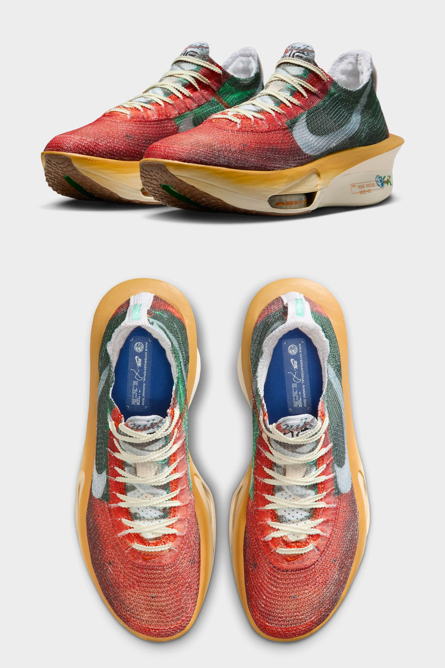 Die Nike Air Zoom Alphafly 3 mit dem Stylecode IH3575 999 erscheinen im auffälligen Colorway „The Sting“ und bringen eine Portion Nostalgie auf die Straße. Der Look ist inspiriert vom Nike Sting aus dem Jahr 1978, einem legendären Performance-Laufschuh, der damals für Aufsehen sorgte. Das Upper kommt aus ultraleichtem und atmungsaktivem AtomKnit, farblich von sattem Aloe Verde im Fersenbereich bis zu knalligem Starfish-Orange im Vorderfuß. Die ZoomX Mittelsohle mit ihrem dezent gealterten Finish sorgt zusammen mit zwei sichtbaren Air Zoom Pods und einer Carbon Flyplate für Highspeed-Performance. So vereinen sich moderner Laufschuh und Retro-Feeling in einem spannenden Mix, der sowohl auf der Strecke als auch optisch überzeugt.