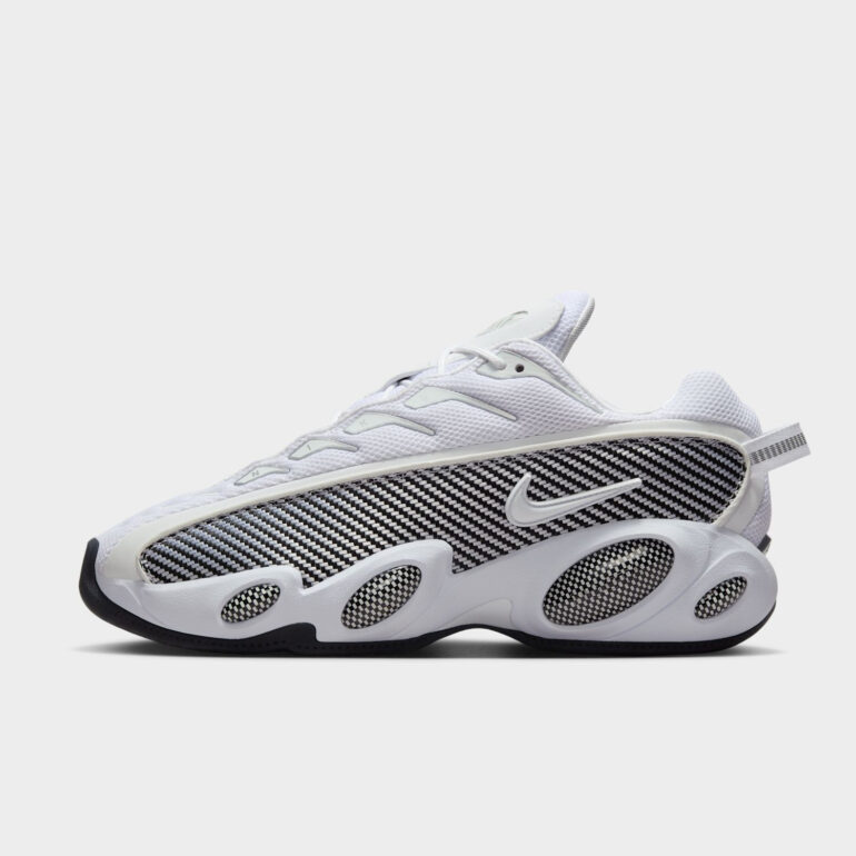 Nike bringt mit dem NOCTA Glide in White/Black wieder ein Stück 90er Basketball Feeling zurück. Die Silhouette erinnert klar an die Zoom Flight 95 mit den markanten „Bug Eyes“ in der Midsole und einer dynamischen Linienführung, die damals wie heute auffällt.