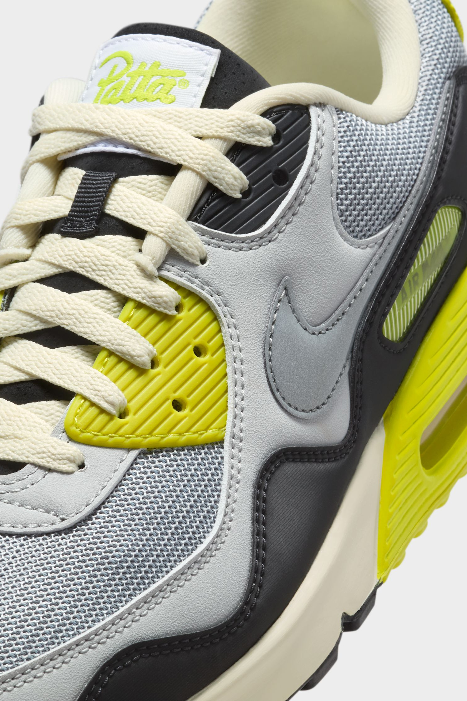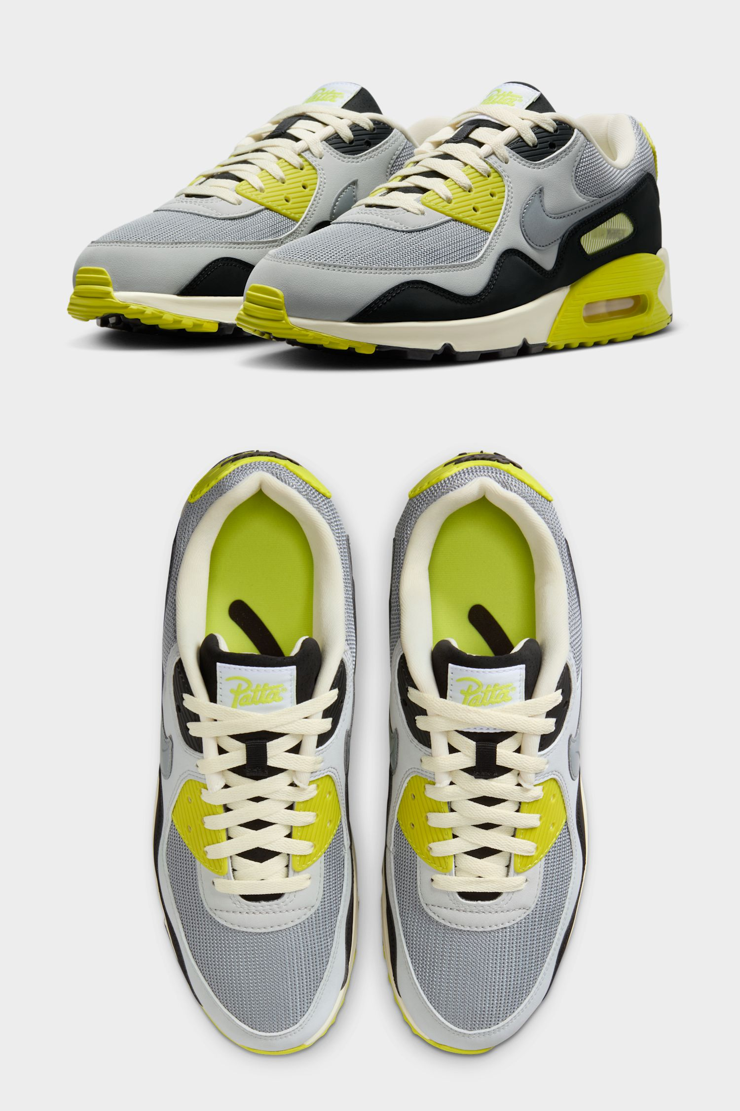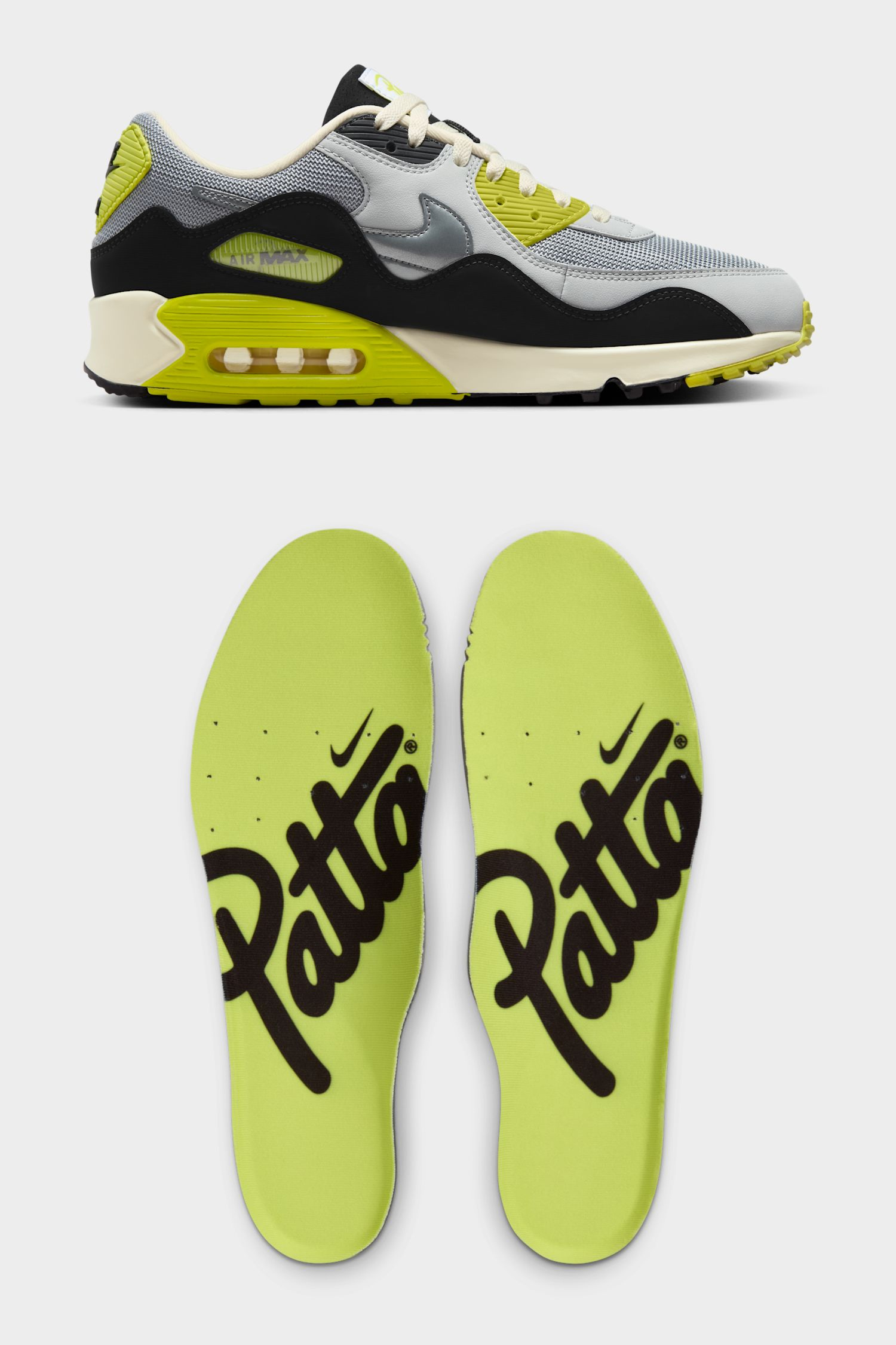 Der Patta x Nike Air Max 90 SP „Waves“ (Stylecode HF8814‑001) kommt im Cyber-Colorway mit Particle Grey, Neutral Grey, Black, Coconut Milk und knalligen Cyber-Grün-Akzenten. Auffälligstes Detail: das wellenförmige Mudguard-Design, das an Patta’s frühere Air Max 1-Releases erinnert und dem Retro-Runner einen frischen Twist verpasst.